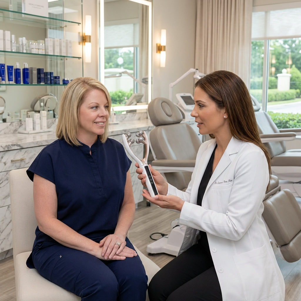 - Rhythmic Vibration & Sculpting Massage - Enhances relaxation, eases facial tension, and supports better product absorption for a spa-like experience.